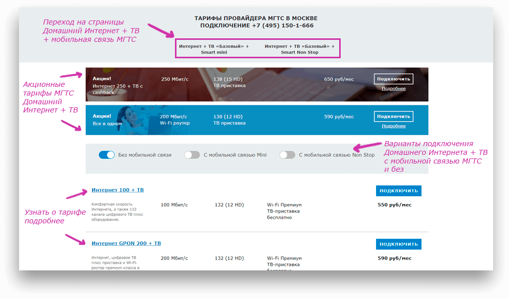 Абонентам – физическим лицам провайдер MGTS предлагает широкий спектр тарифных планов. При этом помимо уже готовых вариантов клиенты имеют возможность собрать свой собственный комплект услуг, которые они хотят получить. С подробным описанием тарифов для той или иной услуги вы можете ознакомиться, нажав на соответствующую кнопку.